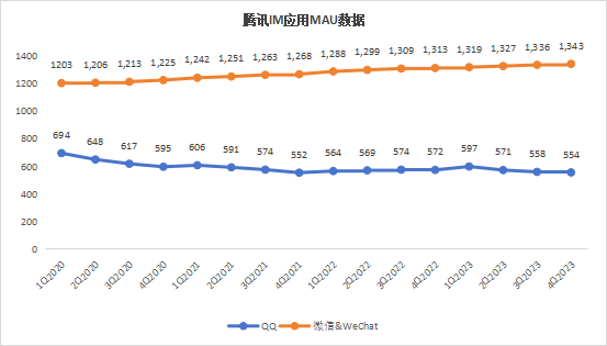 騰訊的流量池衆所周知,分別來自QQ和微信兩大固若金湯的IM產品。截至23Q4,QQ的MAU數額為5.54億人次,相較於年初的高數額回落明顯。而微信MAU則在年末達到了13.43億人次的新高,基本上已經達到了中國互聯網紅利的頂峰。這份幾乎滿溢的流量池,就是騰訊廣告業務的最有力支柱。