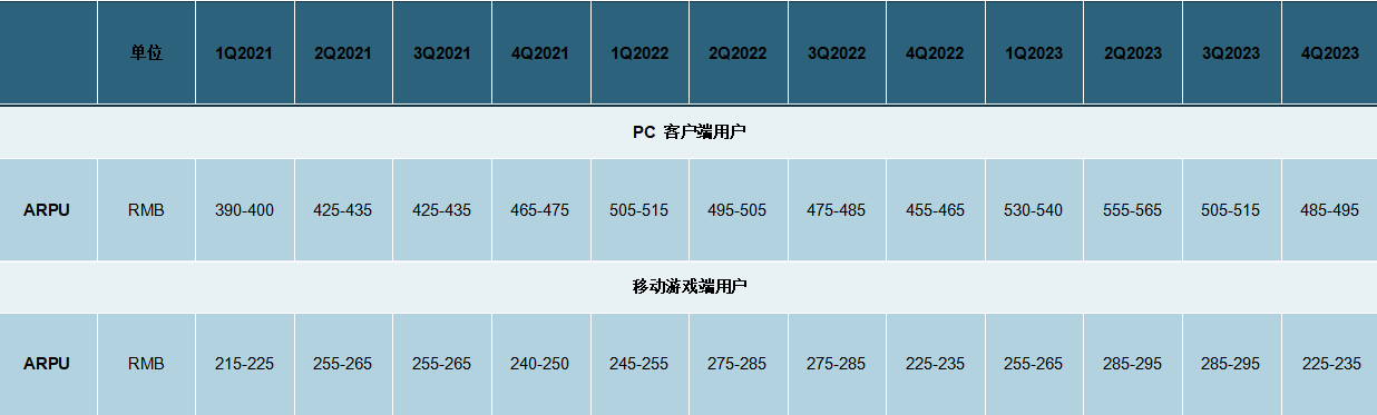 根據騰訊官網給出的數據來看,截至2023年4季度,公司PC端遊戲用户的ARPU為485元-495元人民幣,全年較2022年有明顯提升。而移動端遊戲的ARPU則整體偏向震盪,或與小程序遊戲走量,降低客單價收入的原因有關。儘管端遊體量無法和手遊端相提並論,但或許2023年公司遊戲業務的主要收入增長,與端遊的APRU爬升有所關聯。