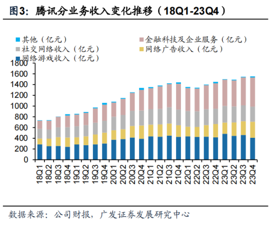 從業務分佈來看,遊戲依舊是佔騰訊收入大頭的核心業務,也是騰訊最賺錢的業務。但從增長活力來看,金融科技業務和廣告收入業務的增長動力是最強的,遊戲相較之下就略顯頹勢。不過隨着《地下城與勇士手遊》的版號過關,公司對遊戲業在2024年的增長充滿信心。