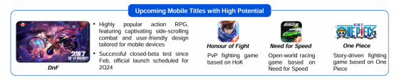 不過就2024年來説,騰訊手遊端還算有《地下城與勇士手遊》、《代號破曉》、《極品飛車》、《海賊王》等一系列令人期待的新作在,從遊戲品類上也算是當前手遊市場稍有空缺的賽道。根據公司管理層在電話會議上給出的預告,預計《地下城與勇士手遊》上線的2024年二季度,將是公司遊戲業務改善的關鍵時點。