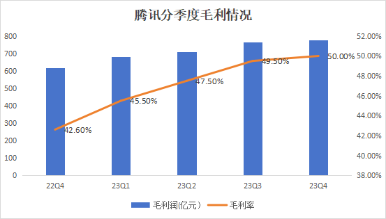 最后來聊一聊騰訊的「賺錢能力」。截至2023年末,騰訊實現了2391億元人民幣的年度毛利,較去年同期增長了23%,毛利率提升了5pct至48%,細分到各項業務上則均有提升。拆分來看,從2023年一季度開始公司毛利率的回升就非常明顯了。在營業成本基本持平去年的背景下,可以看出公司在提升收入及控費方面均有成效。
