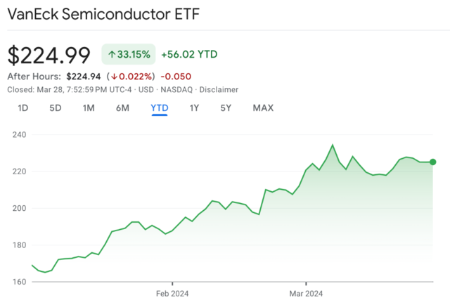 在AI浪潮下,VanEck半導體ETF(SMH)漲幅達到了28.5%,有望創下自2023年第一季度以來的最大季度漲幅。費城半導體指數和半導體行業ETF一季度分別累漲約17.5%和17.7%。