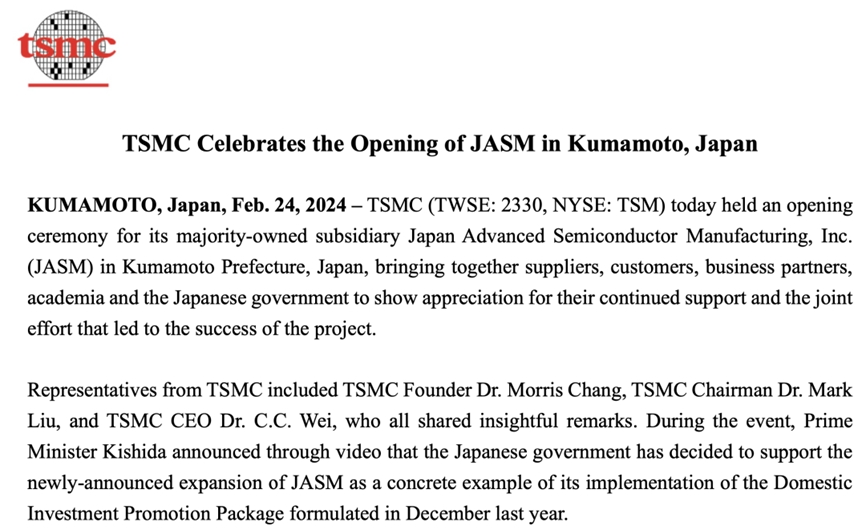 圖:臺積電日本熊本一廠開幕公告