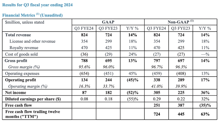 圖:Arm公佈的2024財年第三財季財報