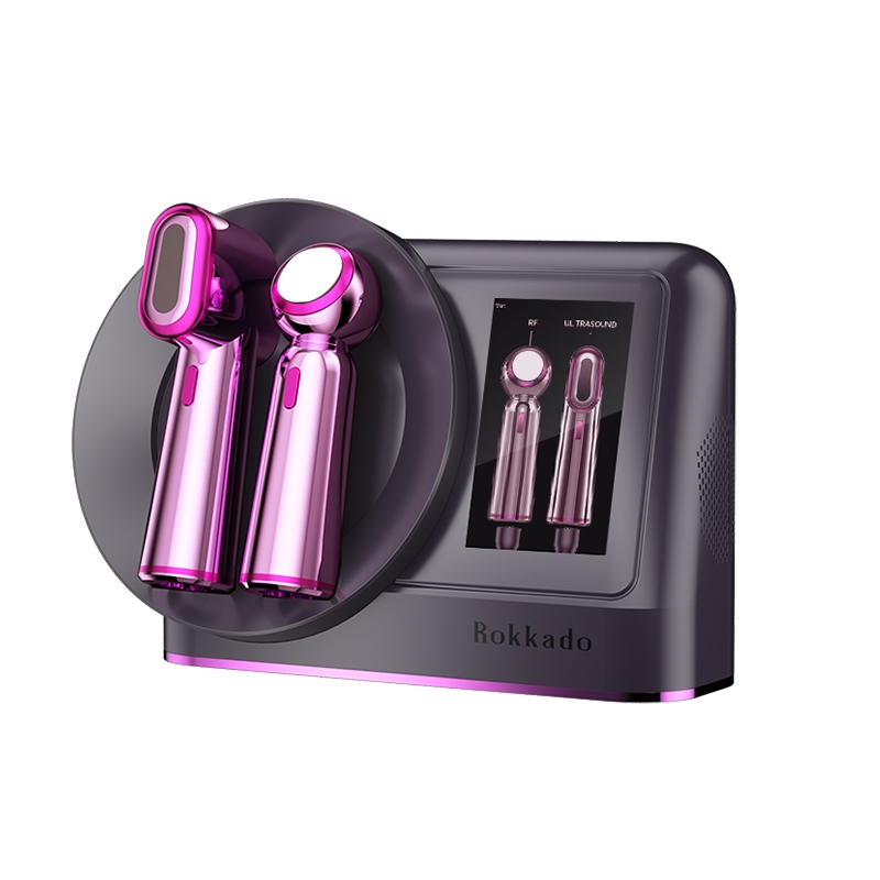 Rokkado美容儀的形態是在機器上搭配兩個手柄,超聲手柄為超聲刀+超聲炮雙項目結合,無需換頭自動調節1.5毫米,3.0毫米,4.5毫米三種深度,功率達到72瓦,能量發數最高有21發,有除皺、瘦臉、提拉緊緻以及自定義四種模式。用户可以在超聲能量、輸出點數及輸出深度上有10檔調節選擇。
