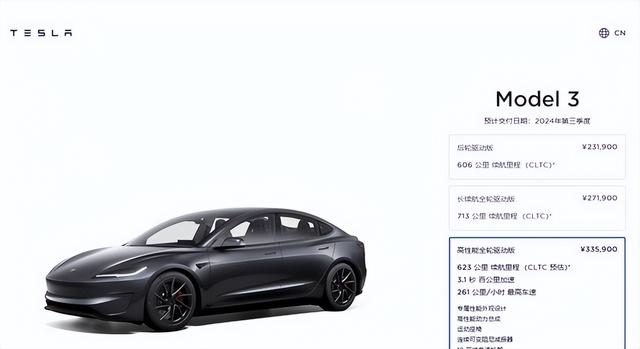 新款 Model 3 高性能全輪驅動版擁有 623 公里續航里程 (CLTC 預估)、3.1 秒百公里加速、261 公里 / 小時最高車速、專屬性能外觀設計、高性能動力總成、運動座椅、連續可變阻尼減振器、19 英寸曲速輪轂、賽道模式 V3。
