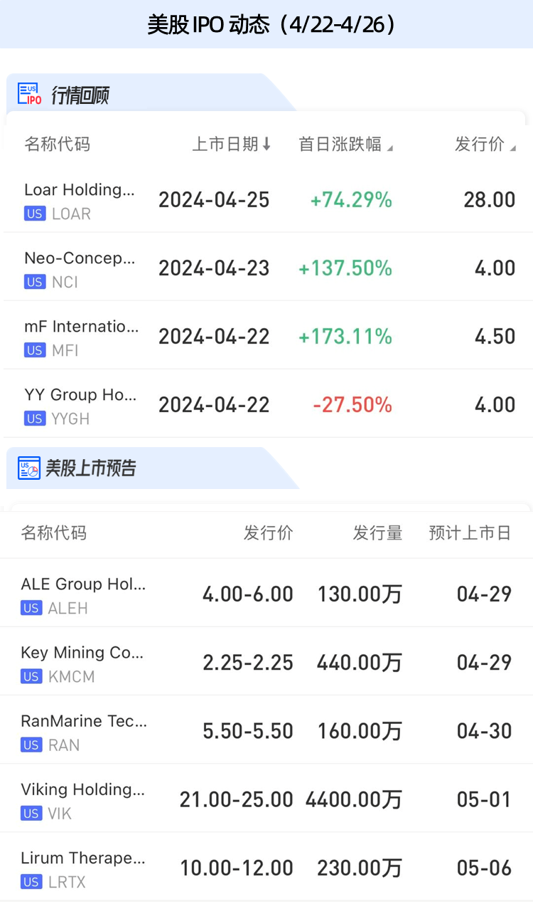 ALE Group.、Key Mining將於4月29日上市,RanMarine Technology將於4月30日上市,Viking Holdings將在5月1日上市。