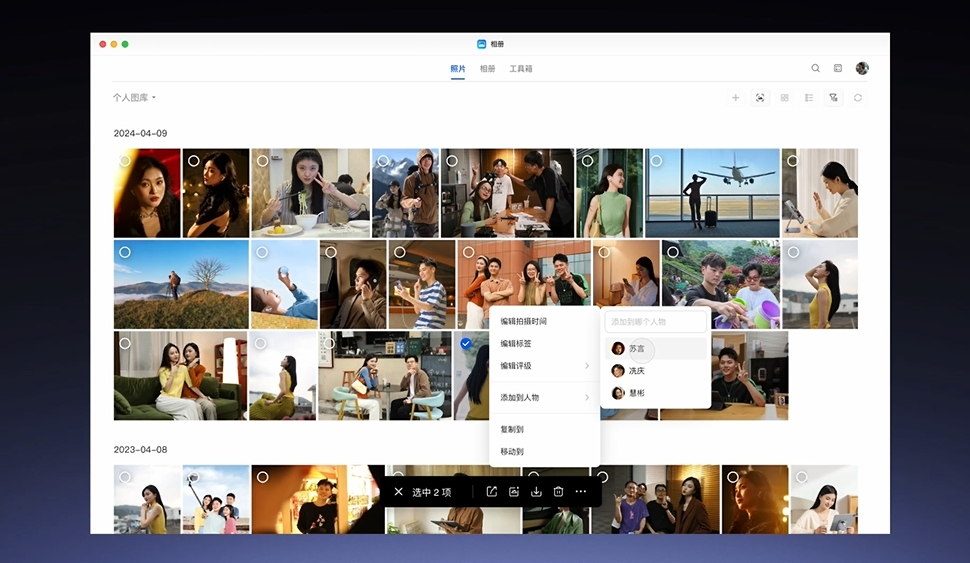 在「人物相冊」中,不同人物的正側臉和模糊五官都可以被AI識別出來。而面對AI無法識別到的背影等人物照片,綠聯加入了「一鍵添加到人物相冊」的功能,用户可以手動將它們增加到對應的人物相冊中,形成人物相冊而非「人臉相冊」。