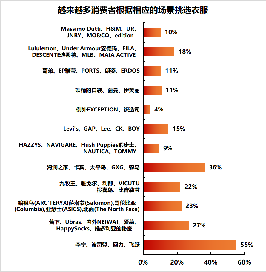 調研數據顯示,越來越多的消費者會根據相應的場景挑選品牌,超一半的消費者經常購買李寧、波司登、回力、飛躍等國貨品牌,商務休閒類品牌也頗受消費者青睞,有36%的消費者經常購買海瀾之家、卡賓、太平鳥、GXG、森馬等品牌;選購內衣時,27%的消費者會經常購買Ubras、愛慕等品牌的產品。