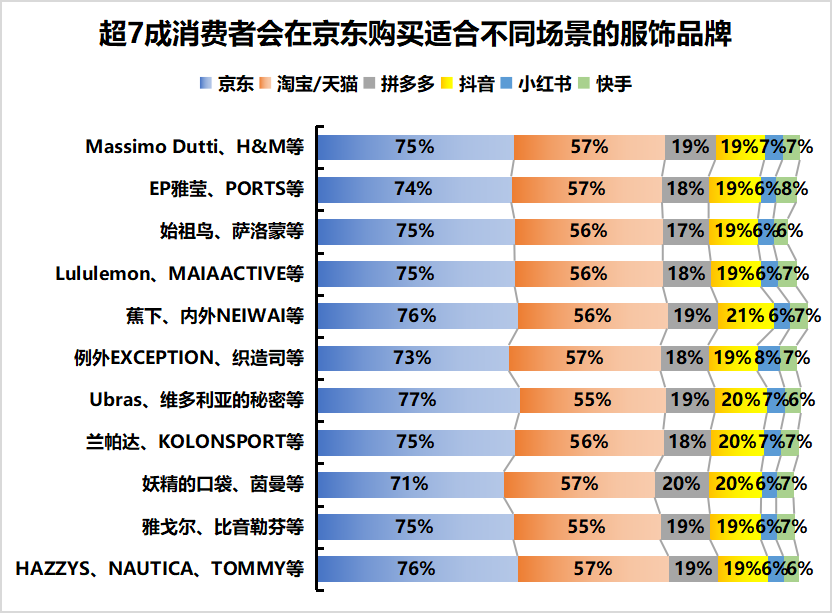 對於消費者而言,線上購物的一大特點便是能一站式購買豐富的產品,根據調查結果顯示,有超過7成的消費者在京東能買到覆蓋不同場景、滿足各個年齡階段的品牌服飾。