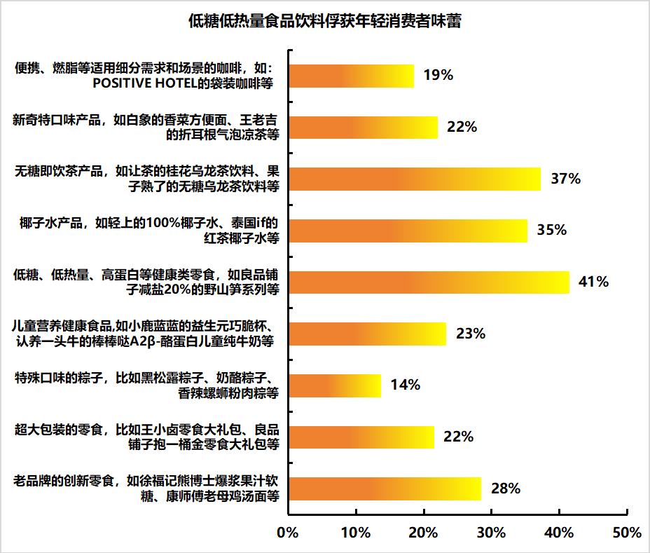 當養生、減脂成為一種常態化生活方式時,消費者普遍表現出對低糖低熱量食品的極大熱情,比如無糖即飲茶、椰子水等。調研結果顯示,超4成消費者關注了低糖、低熱、高蛋白等健康類零食,椰子水、無糖即飲茶也獲得了超3成消費者的關注,一躍成為酒水飲料中的爆款單品。