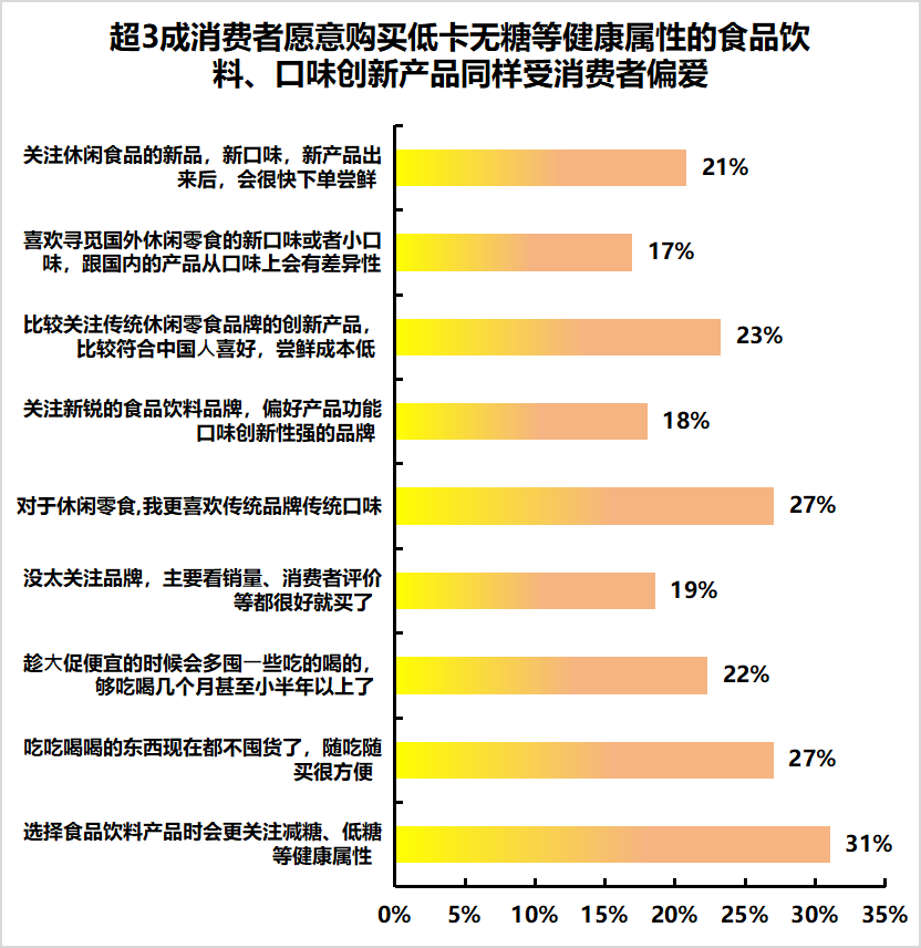 消費者對食品飲料的購物習慣基本與他們的關注方向保持同步,超3成消費者選擇食品飲料產品時會更關注減糖、低糖等健康屬性,21%的受訪者在新產品、新口味出來后,會很快下單嚐鮮。