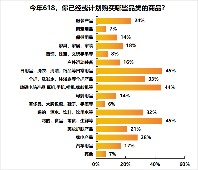 本次調研結果顯示,今年618期間,消費者購買商品排名前列的品類分別是日用品(45%)、食品生鮮(45%)、數碼產品(44%)、個護產品(33%)、酒水飲料(32%)、家電產品(28%)。