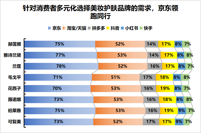 在美粧護膚產品的購買平臺選擇上,京東、淘寶/天貓成為主要購買渠道。就具體品牌情況來看,78%的消費者選擇京東購買蘭蔻產品,75%的消費者選擇京東購買赫蓮娜產品,71%的消費者選擇京東購買毛戈平產品……京東美粧護膚品牌、商品豐富度得到消費者的普遍認可,在不同類型產品選擇上,均有超7成消費者選擇京東購買。