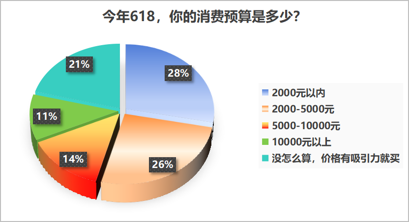 618預算方面,近八成消費者有明確預算計劃。根據調查結果,排名第一的是花費2000元以下,佔比28%,花費金額超過5000元,佔比25%,還有超兩成消費者對購物預算沒有具體的規劃,但是有價格吸引力的產品會促進他們下單加購。