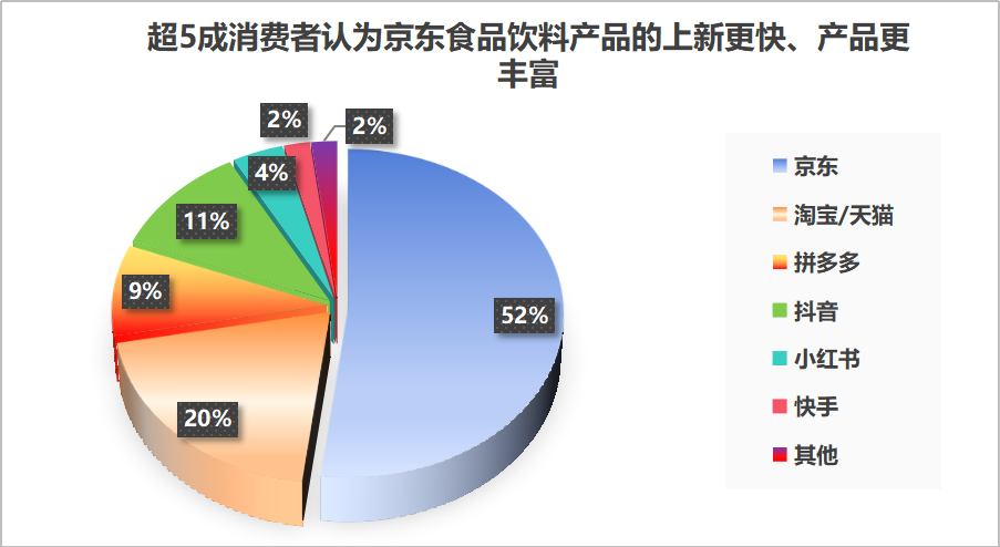 作為高頻購買的類目,食品飲料產品的SKU必須足夠豐富,才能不斷激發消費者嚐鮮的慾望。調查結果顯示,有超5成消費者認為京東零食飲料產品的上新更快、產品更豐富。
