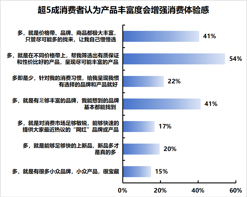 從調查結果來看,關於對「多快好省」中「多」的消費理解上,54%的消費者希望平臺能夠在不同價格帶上,提供有品質保證、高性價比且足夠豐富的產品。41%的消費者對品牌有較大的忠誠度,他們希望在平臺上能找到足夠豐富的品牌。還有超40%的消費者認為,「多,就是價格帶、品牌、商品都極大豐富,只管儘可能多的找來,讓我自己慢慢選」。