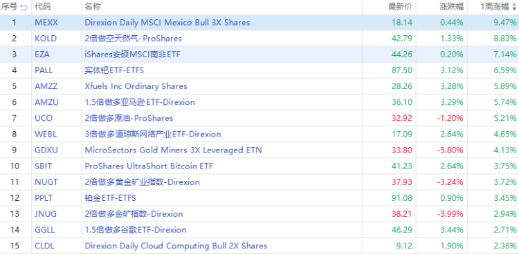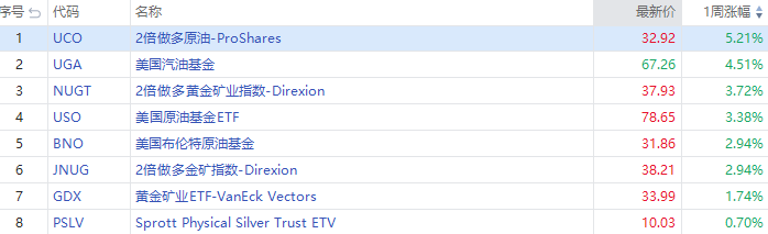 ETF漲幅榜上看:兩倍做多原油ETF $UCO 周漲5.21%,美國汽油基金、美國原油基金ETF、美國布倫特原油基金一周分別漲4.51%、3.38%、2.94%。