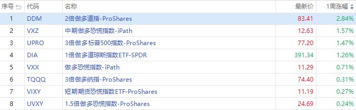 此外,美股周五迎來「三巫日」,市場波動性加劇,做多恐慌指數類ETF集體走高,中期做多恐慌指數-iPath、做多恐慌指數-iPath、短期期貨恐慌指數ETF-Proshares一周分別漲1.57%、0.71%、0.27%。