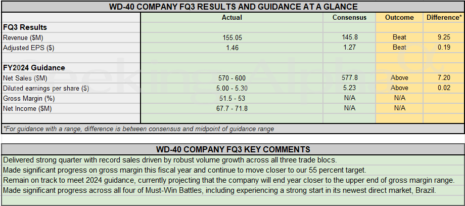 - WD-40 GAAP EPS of $1.46 beats by $0.19, revenue of $155.05M beats by $9.25M