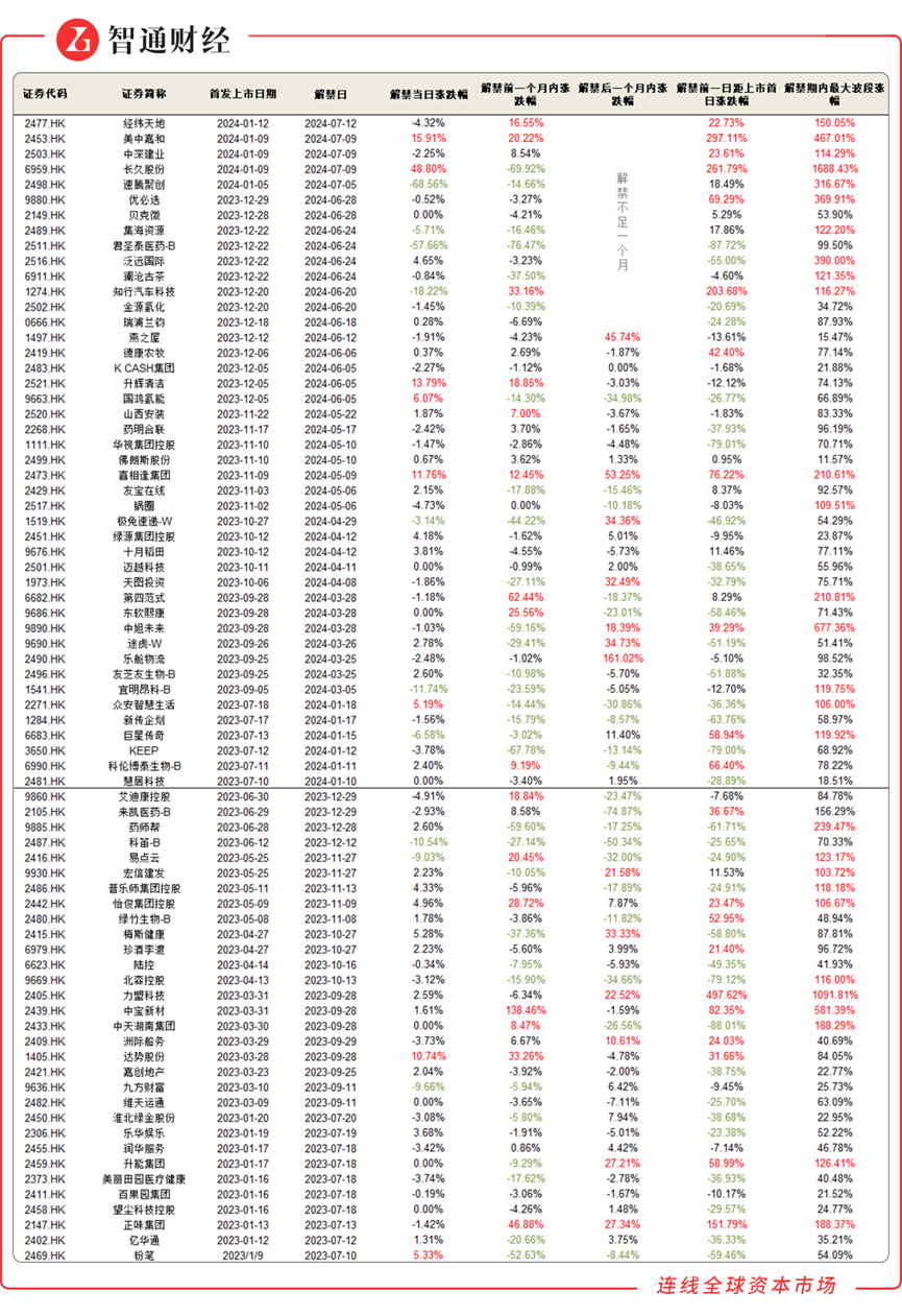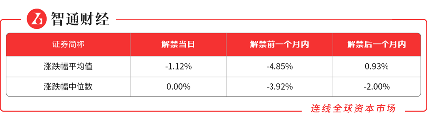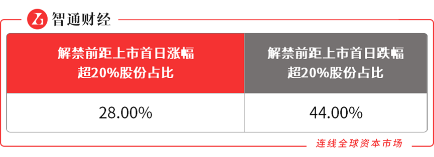 據智通財經統計,2023年至今上市的新股中,已經解禁的股份中,解禁當日平均跌幅為1.2%,解禁當日漲跌幅中位數為0%。也就是説,有一半股份在解禁日都會出現下跌,另外一半則上漲。