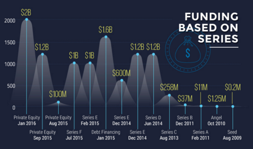 融資歷程長,估值一輪輪提升,導致最初的投資人在后進融資輪次中已經有相當可觀的盈利。例如Uber最初天使輪融資20萬美元對應的股份,隨着此后一輪輪估值提升,到上市前已經值4億美元,大約翻了2000倍。