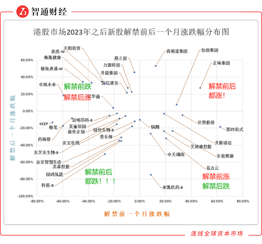 (A)解禁前大漲,解禁后大跌走「倒V字見頂」的股份有第四範式、東軟熙康(熙康雲健康)、艾迪康控股、易點雲、中天湖南等。