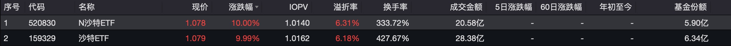 7月16日,华泰柏瑞基金及南方基金旗下沙特ETF分别在上交所和深交所上市交易。当天,两只沙特ETF反响热烈,下午开盘直接封涨停板,南方基金的沙特ETF(159329)及华泰柏瑞基金的N沙特ETF(520830)分别涨9.99%及10%。