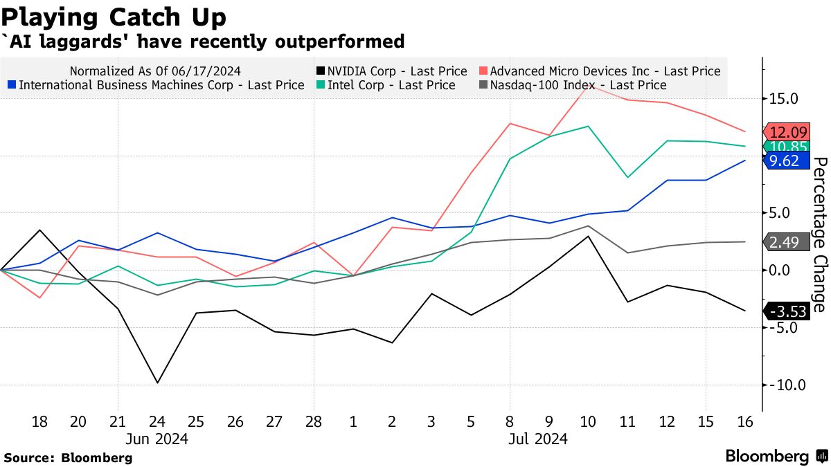華爾街知名投資機構Melius Research發佈報告稱,AI領域的這些「后進者們」,比如英特爾、AMD 、IBM甚至包括蘋果的股價漲勢可能將在今年下半年開始追趕英偉達、微軟和谷歌等人工智能領域的絕對領軍者,引領新一輪的「AI投資狂潮」。