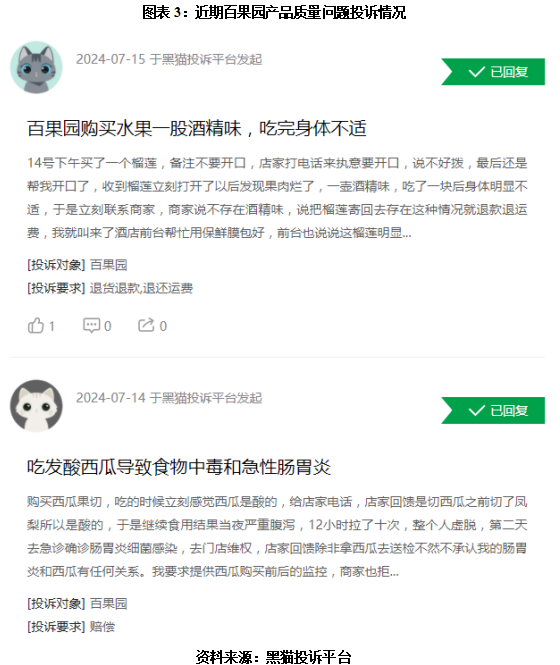 據時代投研統計發現,7月1日—23日,全國12315消費投訴信息公示平臺關於百果園的投訴信息超過120條;近30日內,黑貓投訴平臺關於百果園的投訴信息也超過30條。在兩大投訴平臺中,涉及的產品質量問題投訴較多,如圖表3所示,投訴原因包括水果腐爛生蛆、水果發黴、發臭變質等。