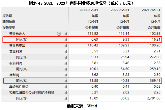 百果園於2023年1月在港交所主板上市,年報顯示,如圖表4所示,2021—2023年,百果園的營收同比增長率分別為16.21%、9.93%、0.69%;淨利潤同比增長率分別為369.49%、40.35%、11.88%,均呈快速下滑態勢。