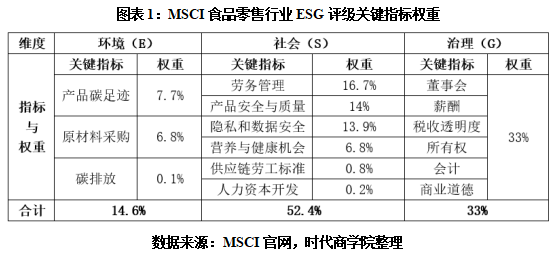 食品零售企業在三項維度表現的差異,對其ESG最終得分的影響有所不同。以MSCI的評級模型為參考,如圖表1所示,對百果園所屬的食品零售行業而言,「環境」(E)、「社會」(S)、「公司治理」(G)三項維度的權重分別為14.6%、52.4%、33%。
