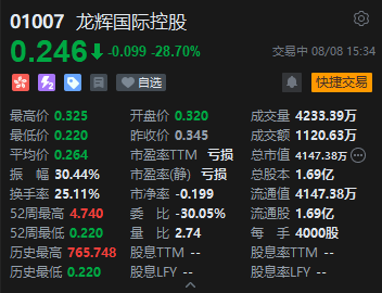 8月8日消息,港股龍輝國際控股再度跌超28%,報0.246港元,昨日,該股閃崩跌超90%,抹去今年四月以來全部漲幅。