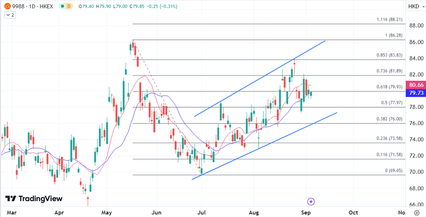 接下來,若阿里巴巴確認獲納入港股通,有望進一步受到內地資金追捧,將為阿里巴巴的長期業績及估值前景帶來正向影響,不過有望納入港股通的利好消息已一定程度反映在股價之上,即便屆時消息落實,股價要繼續突破5月份創下的高位的動能可能受限。目前先關注主要均線可能充當通向80港元的阻礙,維持其下方則保留下望趨勢線支撐的可能。