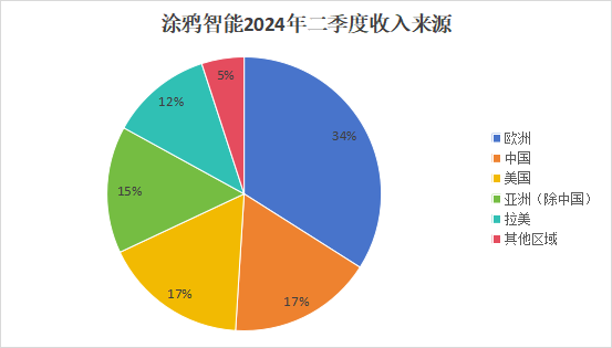 隨着全球經濟復甦步伐加快,得益於出海和需求恢復,物聯網行業的營收和利潤增速恢復增長。而塗鴉智能在經營的早期,就將市場方向放在了國際市場中,其主要客户羣體與收入來源也更地聚焦海外環境。根據公司管理層所述,在公司2024年2季度的收入中,有83%的收入來源於國際市場,其中歐盟佔比最高,達到34%。
