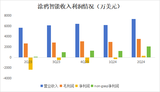 8月26日美股盤后,塗鴉智能發佈了截至6月30日止的2024年中期業績公告。報告期內,公司實現了1.35億美元的營業收入,同比增長29.1%,毛利率上升2.3個百分點至47.9%,Non-GAAP淨利潤率為5.0%。單看二季度,塗鴉智能首次實現了會計公認準則下的正向盈利,跨過盈虧拐點。