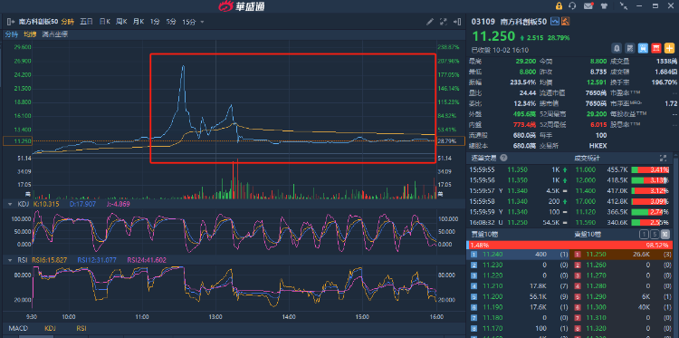 2日上午港股開盤后,港股ETF截圖已經在各個社交平臺流傳,到了11點30分左右,南方東英科創板50指數ETF暴漲234.3%,更是將港股ETF的關注度推至高峰。