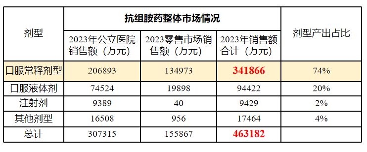 據米內網數據顯示,中國抗組胺藥市場整體規模龐大,總體市場容量約為46億元,其中,口服常釋劑型佔據主導地位,市場規模達到約34.2億元人民幣,佔比高達74%。由此可見,抗組胺藥口服市場擁有極為可觀的總體規模。