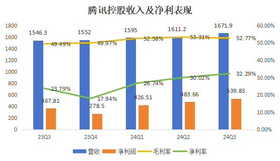 具體來看,在截至9月30日止的三個月中,騰訊實現分佔聯營以及合營公司盈利金額達到60.2億元,佔除税前利潤的9.6%,而這一比例在2023年同期僅為4.4%。與二季度相同,隨着消費市場的信心回暖,公司在2024年的投資收益顯著增加,成為公司盈利端的厚增點。