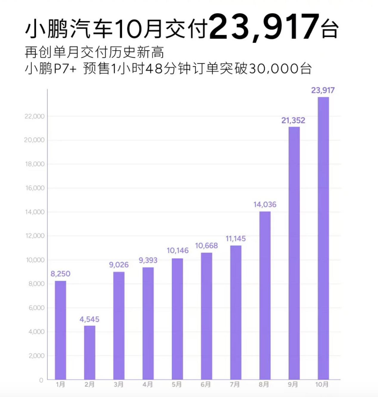 其实,何小鹏预测今年11月小鹏汽车交付量就有望超过3万辆。同时小鹏MONA M03和小鹏P7+还有大量累积订单。这意味着在明年一季度,小鹏汽车将继续迎来高速增长。