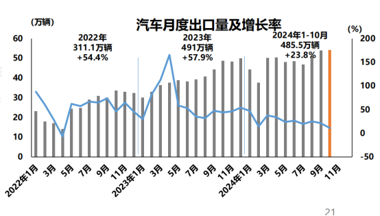從出口數據來看,1-10月,中國汽車出口數量達到485.5萬輛,同比增長23.8%,其中乘用車出口410萬輛,同比增長24%。拆分類別來看,傳統燃料汽車出口379.8萬輛,新能源汽車出口105.8萬輛。可以看到,新能源汽車的出口增速確實受部分歐美國家的政策導向而有所放緩,但其整體規模依舊是維持向上的。