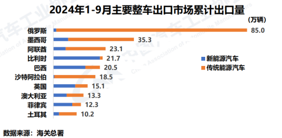 根據海關總署披露的信息來看,截至9月,中國主要汽車出口市場前三為俄羅斯、墨西哥以及阿聯酋。而聚焦到新能源汽車市場,則是比利時、巴西和英國。儘管在市場輿論中,中國汽車面臨着來自海外市場的政策限制,但同樣也有不少國家對中國出口的汽車產品抱有歡迎態度。在未來的汽車出口戰略中,相較於打破歐美市場的壁壘限制,開發更多新的國際市場或許會是車企會選擇的方向。