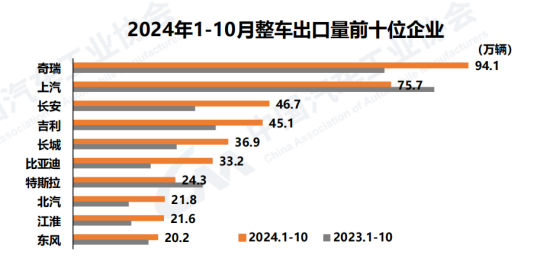 而在智駕之外,汽車產品的出海則是可以從前文看出的另一條出路。只是出海本身需要企業具有充足的資金成本來支撐國際貿易,海外建廠,本土銷售渠道等一系列沉沒成本,而從目前的國內車企來看,主要還是資金實力比較雄厚的傳統車企在這方面的成果比較顯著。在2024年1-10月,奇瑞、上汽和長安則是出口量最多的三家企業,而比亞迪、北汽與長安汽車是出口增速最快的車企