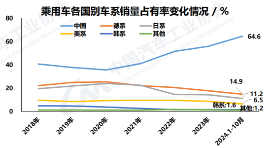得益於國內汽車產業鏈的崛起,國產品牌乘用車在近年來的市場認可度快速爬升,與進口品牌的乘用車銷量差距逐漸拉大。2024年1-10月,中國品牌的乘用車銷量達到1384.9萬輛,同比增長21.2%,佔全部汽車銷量比例達到64.6%,較去年同期上升了9.3個百分點。與之對應的,進口品牌,且尤其是日產品牌的銷量佔有率下降明顯,也帶動了部分國內企業的業績承壓。
