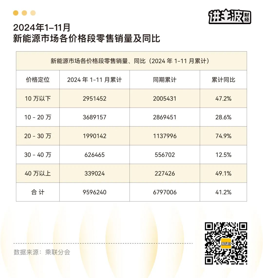 乘聯分會發布的報告顯示,2024年1-11月40萬以上新能源車零售銷量累計33.9萬輛,同比增長49.1%,漲幅高於新能源大盤。新能源豪華車,正在分走傳統豪華車品牌的訂單。