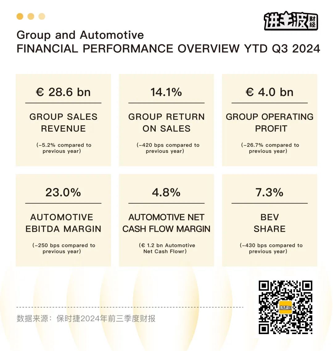 銷量下滑,業績報告同樣不好看。財報顯示,2024年前三季度保時捷全球營收286億歐元,同比下降5.2%;營業利潤約9.74億歐元,同比下降41%;汽車淨現金流12.4億歐元,同比下降63%;營業利潤10.7%,遠低於預期的17%-19%。