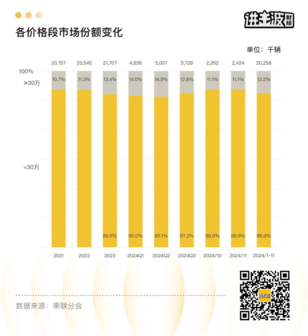 先不説這個推論對不對,我們先來看一串數據。根據中國汽車流通協會公佈的數據,2021年-2023年,中國市場30萬元以上高端車零售量分別為211.4萬輛、251.2萬輛、294.2萬輛。2024年,這個數字是298.6萬輛。2022年到2024年,保時捷銷量逐年下滑,但在同樣的時間線上中國汽車零售均價卻逐年上升。經濟大環境不行所以豪華車賣不動,這個理由似乎站不住腳。
