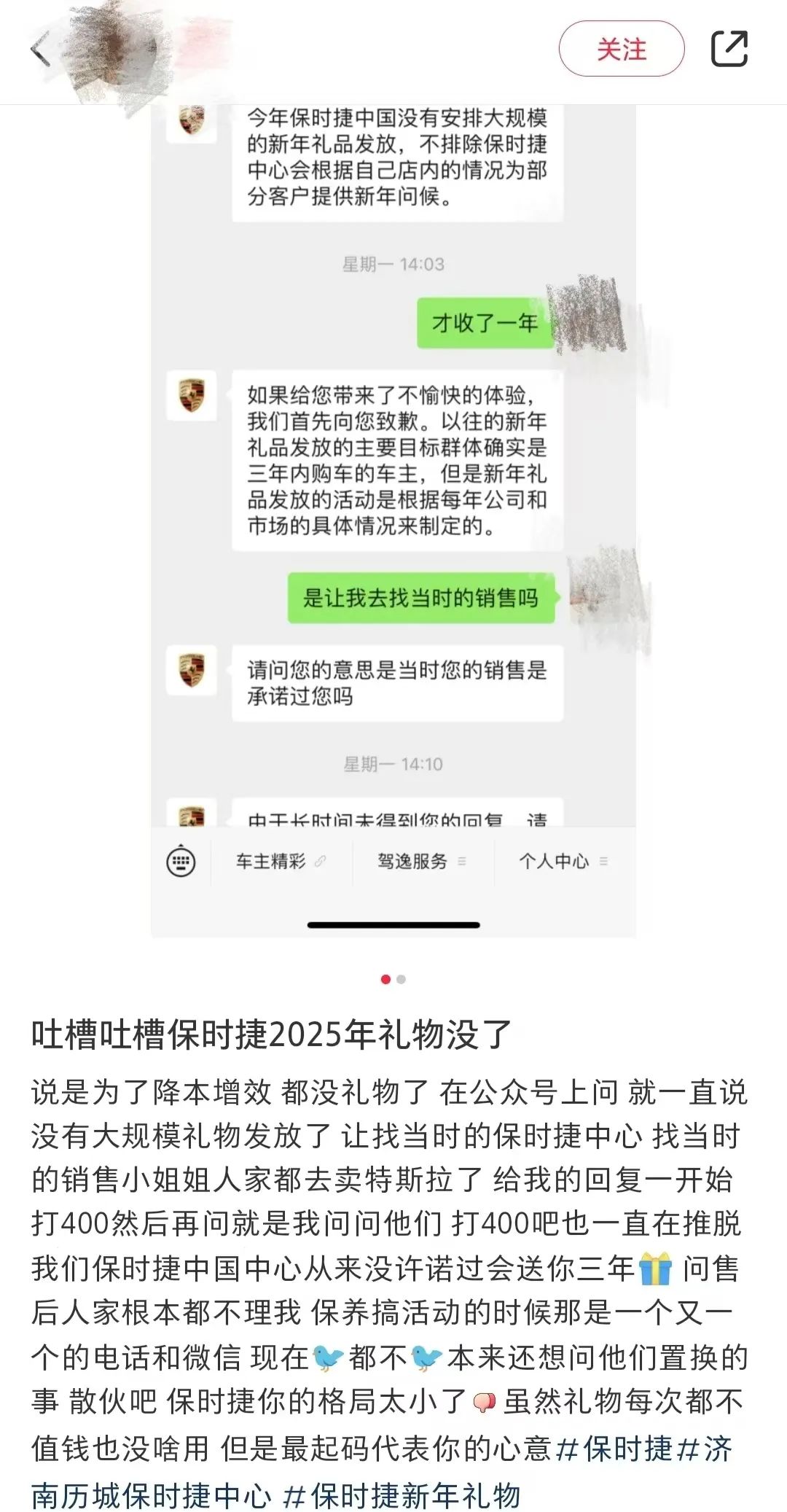 圖:車主在小紅書反映保時捷新年禮物取消