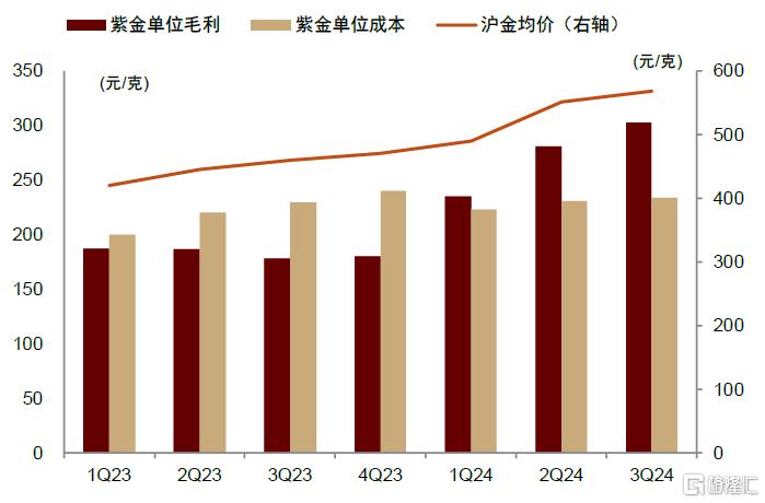 2024年,國內黃金上市公司克金毛利已現反轉回升跡象。以紫金礦業為例,2023年黃金銷售均價由1Q23的420元/克漲至4Q23的471元/克,但由於成本抬升超過金價漲幅,導致季度克金毛利由1Q23的187元/克降至4Q23的180元/克。2024年以來成本整體得到控制,克金毛利自1Q24迎來反轉拐點。1Q24克金成本為223元/克,較4Q23下降17.3元/克,同期金價為490元/克,克金毛利為235元/克,較4Q23回升54.7元/克。3Q24克金毛利為302.5元/克,年內環比持續回升。