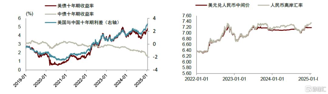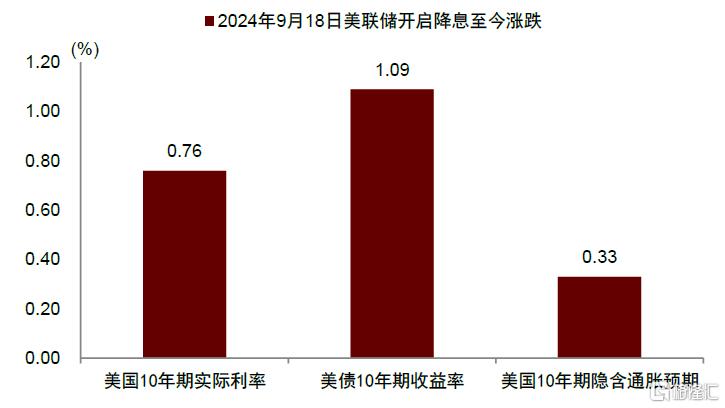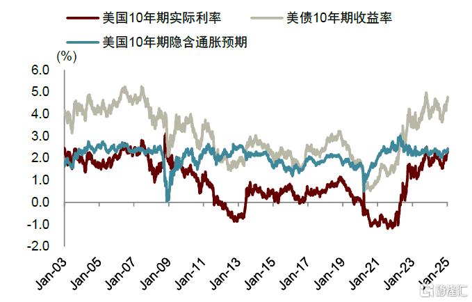 美國十年期實際利率已處於2009年以來的歷史高位。2024年9月18日美聯儲開啟降息以來,截至2025年1月13日,美債10年期收益率大漲109bp,美國10年期隱含通脹預期僅上行33bp,使得美國實際利率大幅上行76bp,達到2.46%的水平。這一水平已經是2009年以來的歷史較高位置,僅次於2023年10月的2.5%。